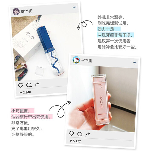 高频脉冲设计,利用细腻的高压水流,冲走齿缝间的污垢。小巧粉嫩的包装,可随身携带,时刻保持社交优雅。