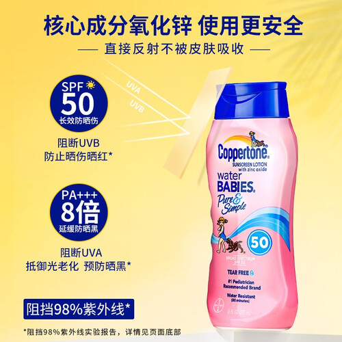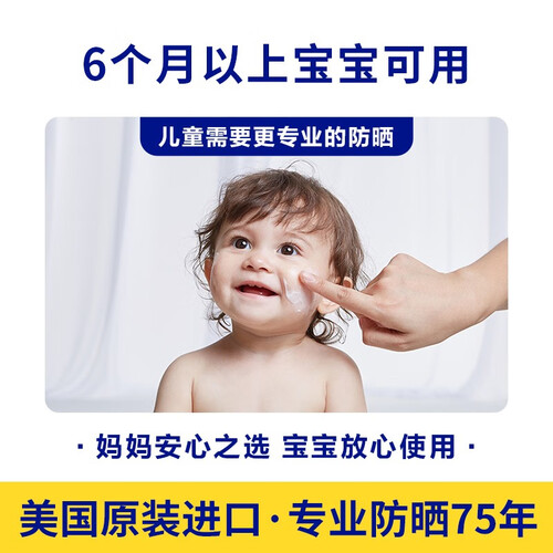 光谱防晒指数SPF50,同时抵抗伤害皮肤的UVA和UVB。无泪配方,6个月以上宝宝适用。滋润保湿,防止干燥。