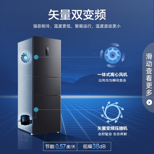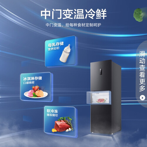 实用三门设计可以轻松安置,不占厨房面积。矢量双变频可以实施感知箱内温度,持久呵护新鲜食材。