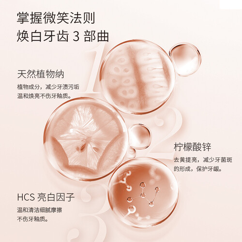 添加天然植酸钠,帮助减少牙渍污垢,温和焕亮不伤牙釉质,协同柠檬酸锌和HCS亮白因子,去黄提亮,令牙齿健康靓白。