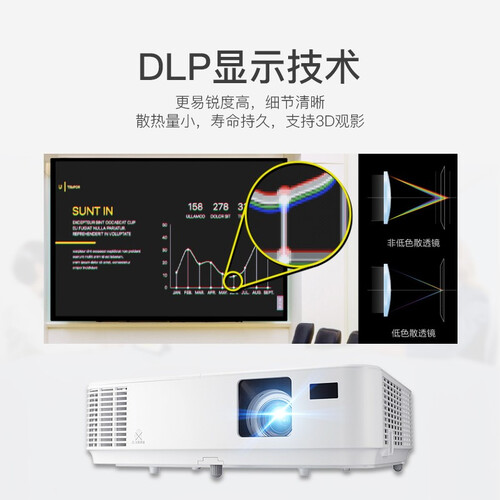 使用DPL投影显示技术,优化画面锐利度,表格文档显示更清晰。采用一键ECO技术,可降低能源消耗,同时延长灯泡使用寿命。