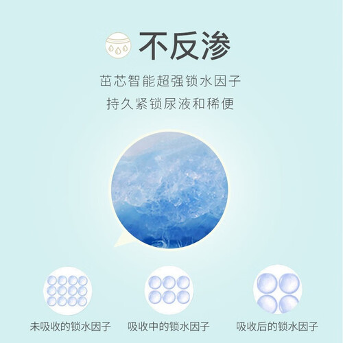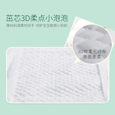 表层采用3D绵柔无纺布,触感柔软,呵护小屁屁。内部采用轻薄高分子复合芯体,吸尿量大,搭配透气防渗透底膜,保持屁屁干爽。