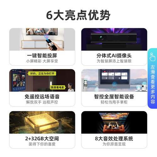 支持一键无线投屏,手机操作和画面无缝衔接,精彩开黑不间断。自带分体式AI摄像头,可实现大屏通话,随时开启云聚会。