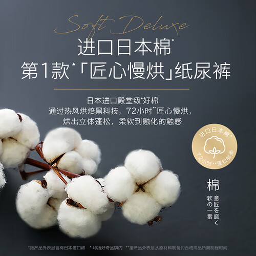 精选日本进口纯正好棉,72小时热风烘焙,塑造出如云般蓬松柔软的触感,减少摩擦。搭配立体透氧气垫芯,加倍呵护宝宝肌肤。