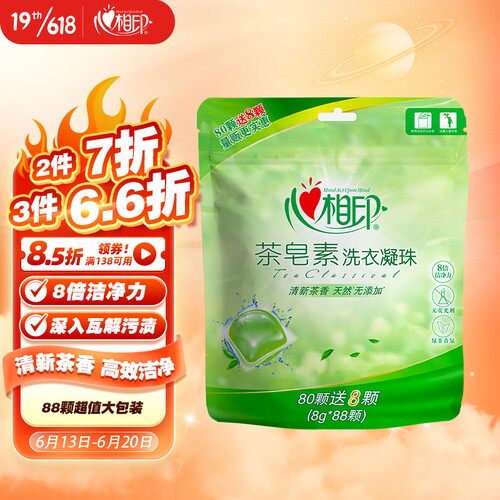 清新的绿茶香味能够去除衣物上的各种异味,小小一颗遇水释放,易漂易清节水省时;含有丰富的茶皂素,可快速除污无残留。