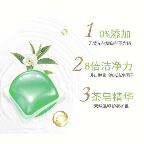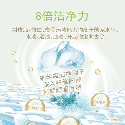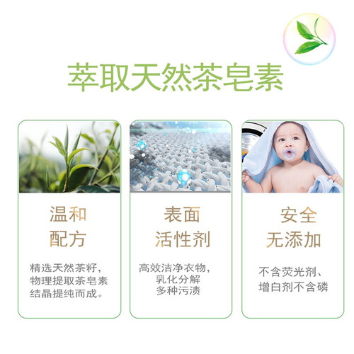清新的绿茶香,洗后衣物留有淡淡的香味,让人心旷神怡,无惧衣物异味困扰;含天然植物原料茶皂素,高效去渍,除污无残留。
