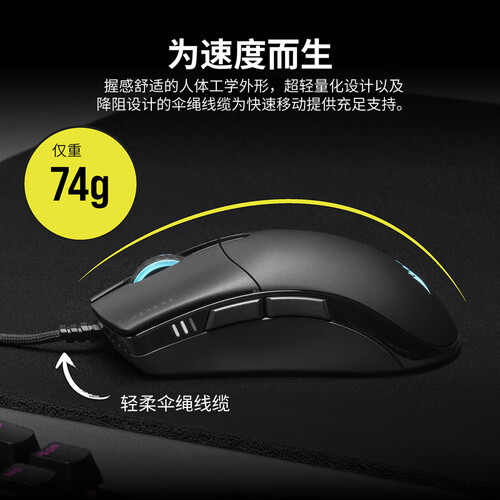 符合人体工学设计的电竞鼠标,贴合掌心弧度,抓握更舒适。结合按键预压技术,触发无延迟,操控更灵敏。