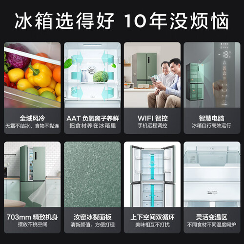 面板采用汝窖冰裂设计,增加了外观的时尚度,清新易打理。采用双循环独立冷却,保证了制冷的均匀,减少食材水分的流失。