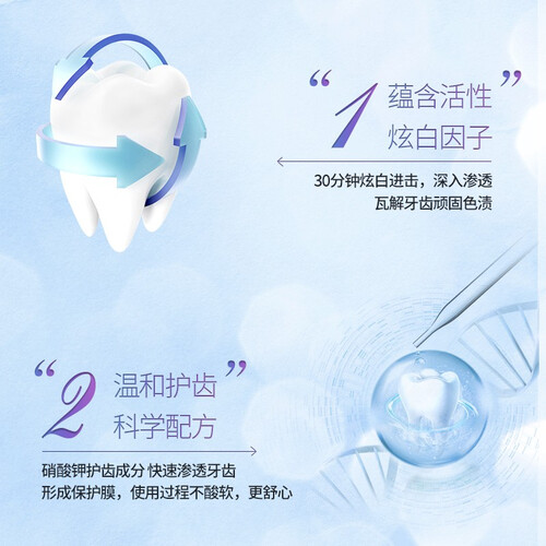 蕴含活性炫白因子,深入渗透瓦解牙齿顽固色渍,含硝酸钾护齿成分,快速渗透牙齿形成保护膜;贴合齿面,均匀炫白牙齿。