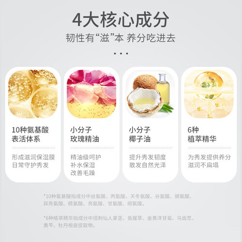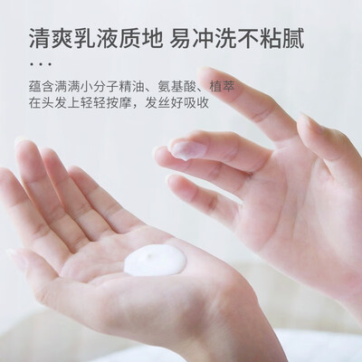 采用清爽乳液的质地,不会产生粘腻感,而且易于冲洗。加入椰油成分,发丝的韧性更好,看起来自然又有光泽。
