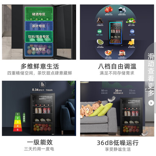 内置4层独立分区,可以同时存放饮料,果蔬和肉类食品,实现有序储存。支持八挡调温,储存不同的食材,可调节更适合的温度。