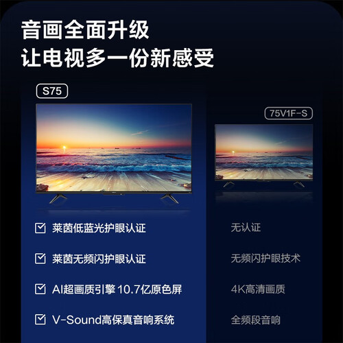 75吋大屏97%高屏占比,三面金属边框搭配4K超画MEMC防抖技术,杜比+DTS双解码,DTS音效处理使观影视听都震撼。