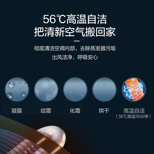 加入了56°C高温自洁技术,可去除蒸发器上的污垢,让出风洁净,呼吸安心。配以一键智享技术,快速直达舒适温度。