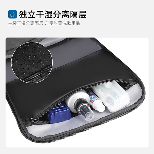 大容量主袋设有干湿分离口袋,用于洗漱用品的收纳,更加卫生方便。YKK定制拉链,耐磨耐用,顺滑不卡顿。