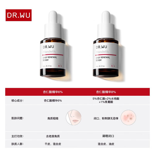 6%的杏仁酸含量,使用后可快速调理角质的新陈代新,避免肌肤的粗糙现象。添加玻尿酸,带来显著的锁水体验感。