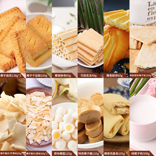 缤纷享受幸福满满的搭配,多重美味的营养美食。内含多种椰子味的零食一口下去满满的幸福感,适当甜度小孩子也可以放心吃。
