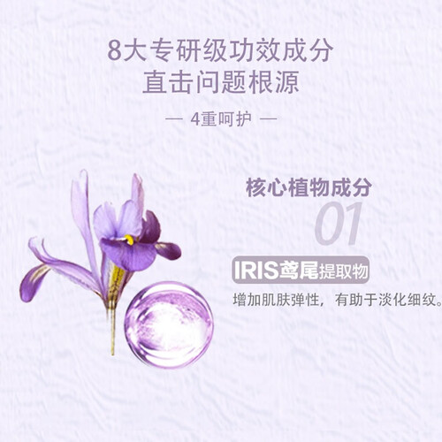 鸢尾精华强健屏障,增强肌肤弹性,更好的应对外界刺激。添加九种透明质酸钠,源源不断为肌肤注入水分,远离干渴危机。