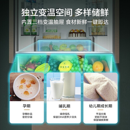 设有独立变温空间,一键调节储鲜模式,储鲜不同食物无烦恼。搭载雷达感温探头,精准感知内部温度变化,打造更适宜的保鲜环境。