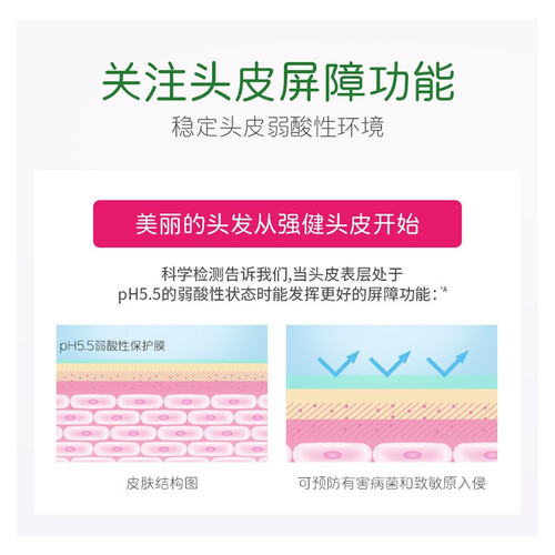 采用椰油清洁配方,减少头屑的产生,避免造成瘙痒异味。弱酸性配方,接近头皮自然PH值,亲和不伤发。