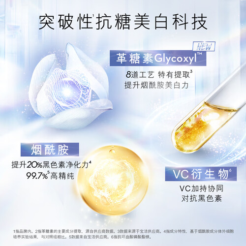 蕴含革糖素,帮助皮肤降低糖化速率,缓解暗黄焕亮肌肤。添加烟酰胺和维生素C,能够减少黑色素生成,让皮肤白净如初。