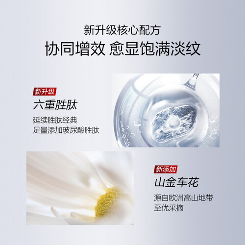 添加5%的六胜肽-1,通过阻截肌肉收缩信号,有效淡化脸部纹路。羽感呼吸微粒,质地轻盈更适合油皮,一抹哑光不限毛孔。