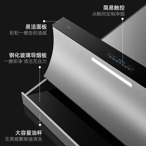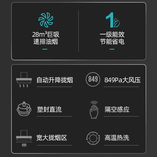 849Pa大风压,排烟顺畅不倒灌,无惧做饭高峰期,使用无忧。采用玻璃面板,不容易残留油污,方便清洁打理,省心省力。