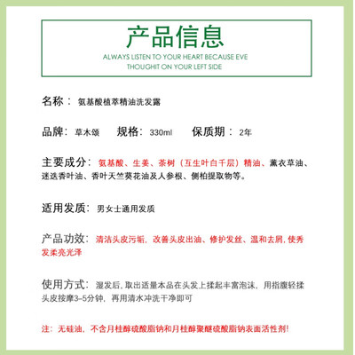 特别添加了霍霍巴籽油、迷迭香叶油、薰衣草油等成分,可以滋润头皮,温和亲肤不刺激。月桂氨基酸表活剂,健康安全。