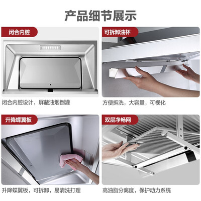 燃气灶表面经过荷叶仿生涂层处理,表面光滑大气,使用不易沾油,日常好清洁一抹即净。升降蝶翼拢烟板,方便拆卸,避免藏污纳垢。