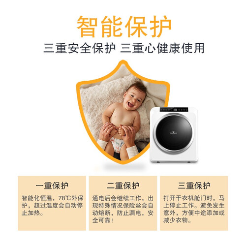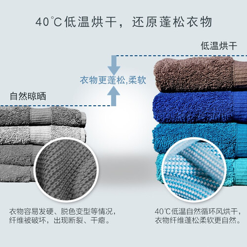 7KG容量,小体积大内筒,轻松应对被套棉衣,解决全家干衣烦恼。60°C中温烘干,减少衣物磨损,不伤衣,更护衣。