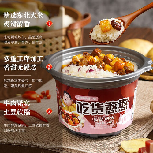 采用产自东北的优质大米,色泽莹润透亮,口感软糯香甜,十五分钟快速自热,呈现美好味道。真实牛肉搭配绵软土豆,味道丰富。