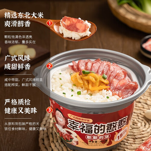 加入正宗广式腊肠,酒香明显油脂丰富,口感紧实不干硬,分量充足吃得过瘾。快速自热操作简单,懒人式享受美味。