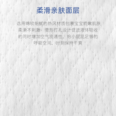甄选优质材质制作的面层,细滑柔韧不会摩擦肌肤,宝宝穿着更加的舒适。配备了优质的芯体,能够容纳宝宝9次的尿量。