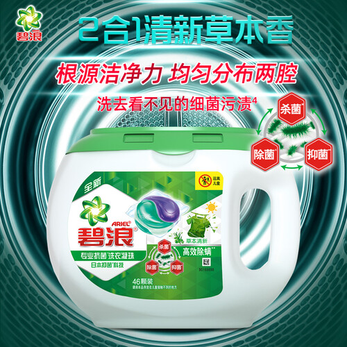 绿色抗菌除螨加洁净,紫色留香加洁净,二者合一均匀分布两腔,高效杀菌、除菌、抑菌,有效去除螨虫及其排泄物。进口高分子水溶膜只溶于水。