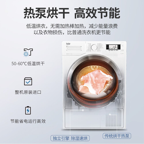 整机来自欧洲原装进口,质检严苛,品质安全有保障,可放心选择。采用热泵低温烘干,节省电量的同时,让衣物更柔软蓬松。