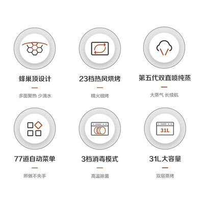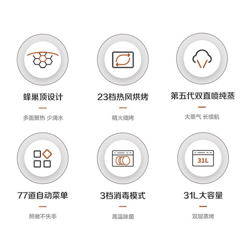77道智能菜单,美食轻松做。第五代双喷纯蒸搭载蜂巢顶设计,打造美味健康。31L大容量,满足全家所需。高温除菌的加持,享受健康美食。