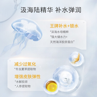 温和舒缓,深层保湿补水,让肌肤柔嫩有弹性。添加植物精萃和深海水母提取物,提亮肤色,维持肌肤稳定状态。