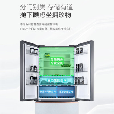 拥有518升大容量,多种食材分类储鲜,满足全家一周食材存放需求。采用雪山岩面板设计,光洁明亮,油污易清理。