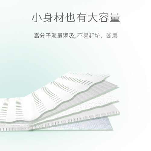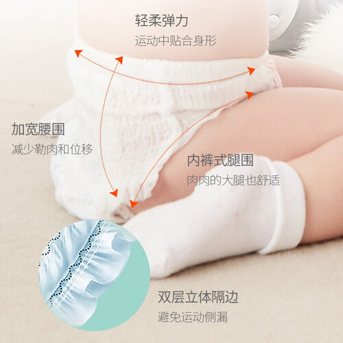 内置悬浮芯体,帮助吸收尿液,有效防止侧漏。采用小内裤式的造型,方便脱下,新手妈妈也能快速更换。