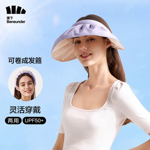 帽箍两用的一款遮阳帽,帽檐舒展开可以当做空顶遮阳帽使用,收卷后就是一个双色发箍,灵活又实用。