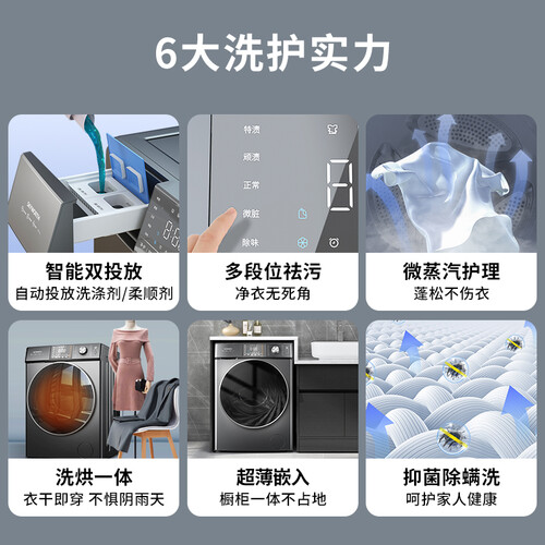 搭载微蒸空气洗护理,无需水洗即可去除衣物异味,助力清新出行。结合智能烘干,衣干即停不过烘,呵护纤维弹性,穿衣柔软舒适。