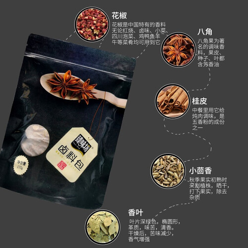 精选花椒、八角、桂皮、香叶等原材料,秘制卤料包,实用卤料,荤素均可卤,无需炒糖色,不会做饭也能卤,专为懒人打造。