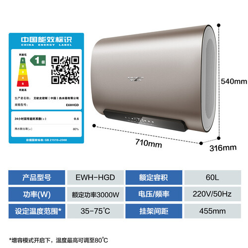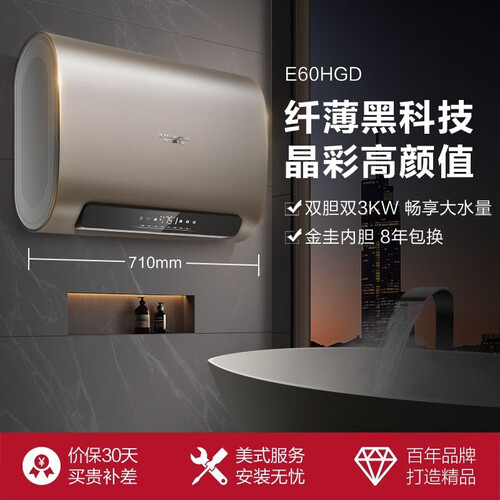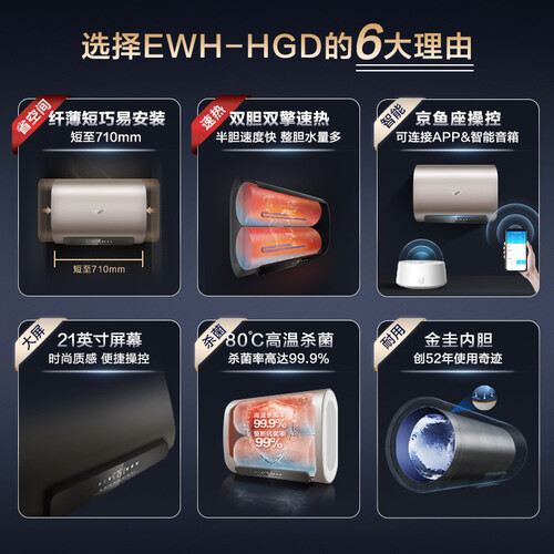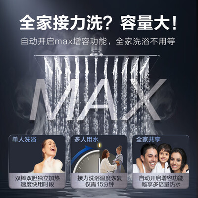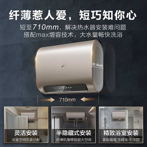 拥有纤薄机身,安装方便不占地,狭小的空间也能装得下;双3KW速热,满足多人用水的需求;配置一键杀菌功能,双重防护,保护肌肤健康。