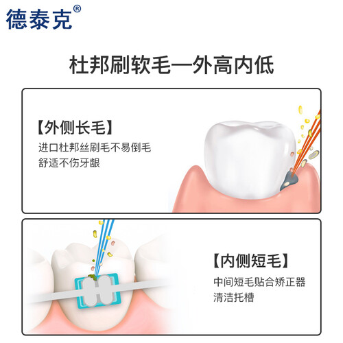 严选杜邦软刷毛,给予脆弱口腔细心的呵护,防止刺激产生的不适。配有牙套设计,便于外出游玩携带,保持刷头洁净卫生。
