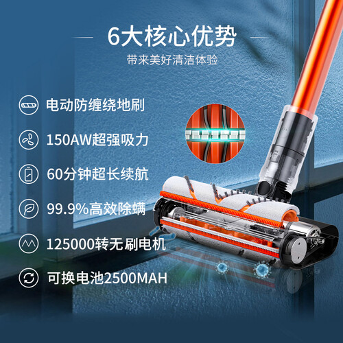 拥有150AW强劲吸力,陈年污尘也能快速吸走,让家居变得更干净。搭载电动防缠绕系统,宠物毛发清洁不缠堵,省心省力。