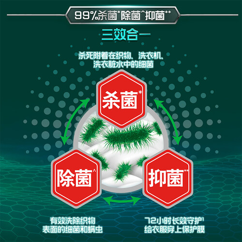 蕴含抑菌因子,带来72小时的长效抑菌效果,呵护全家穿衣健康;仅需一颗,即可搞定6到10件衣物,让你居家清洗更省心。