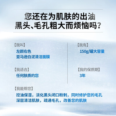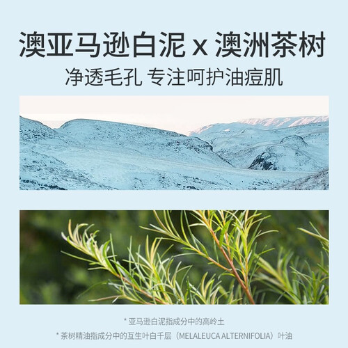 蕴含巴西进口亚马逊白泥,深入毛孔吸附污垢油脂,净澈黑头粉刺;添加澳洲茶树修护精油,舒缓补水,呵护油痘肌。