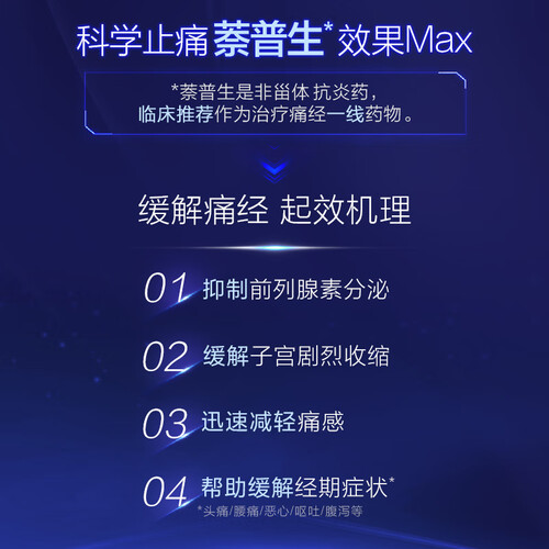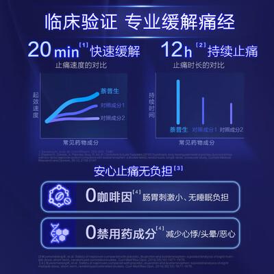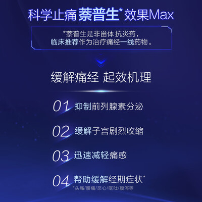 专为痛经设计,采用萘普生配方,成分温和耐受,服用副作用小,深受经期疼痛的女性喜爱。不添加咖啡因,可以随餐服用。