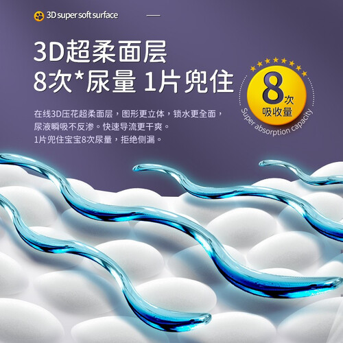 出色的吸收量,可以有效避免侧漏情况,为孩子带来干爽和舒适。采用3d压花超柔面层,立体图案帮助快速导流,提升吸水速度。