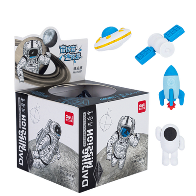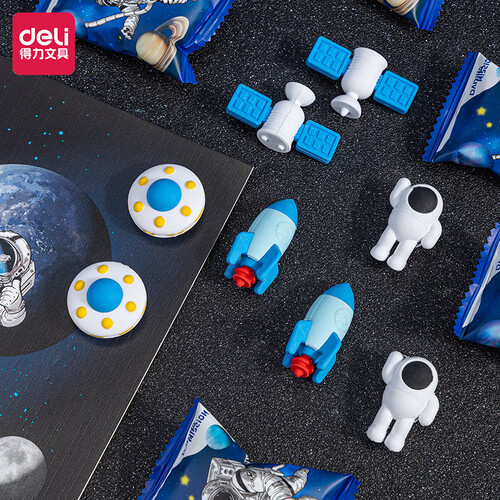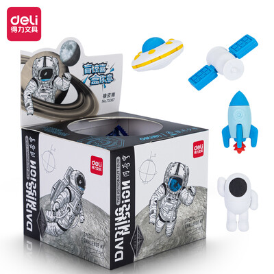 航天造型橡皮擦盲盒,四种童趣造型随机放入,带给孩子们惊喜。橡皮擦擦除不留痕迹,重现纸面洁净,更方便孩子们书写,美观又实用。