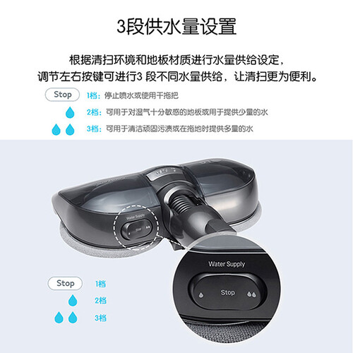 具有双电双充功能,配备两块可以替换的充电锂电池,可持久续航。复合式电动拖把吸头,支持三段供水,满足不同环境的使用需求。